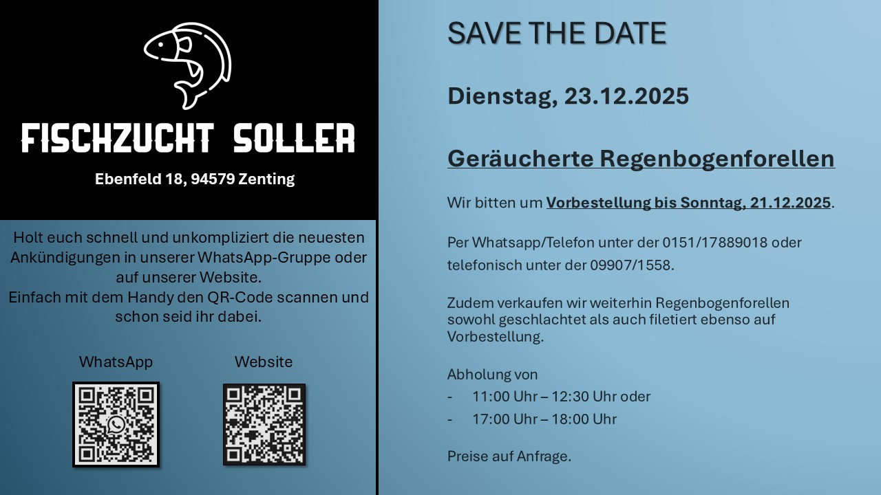 Am Dienstag, den 23.12.2025 gibt es wieder geräucherte Regenbogenforellen auf Vorbestellung. Bitte meldet euch unter den angegebenen Telefonnummern zur Vorbestellung! Ebenso sind auch frische und filetierte Forellen auf Vorbestellung erhältlich.