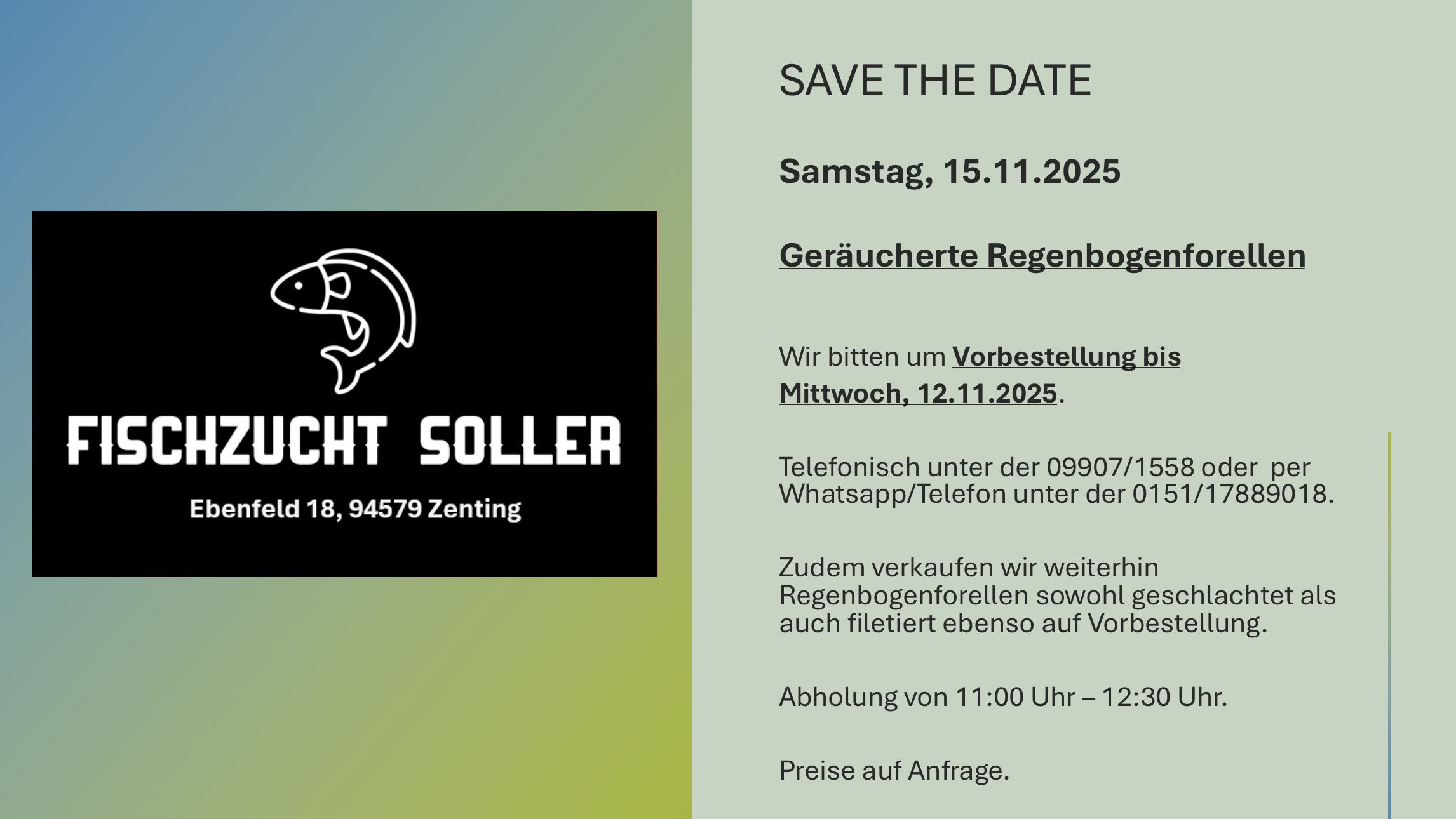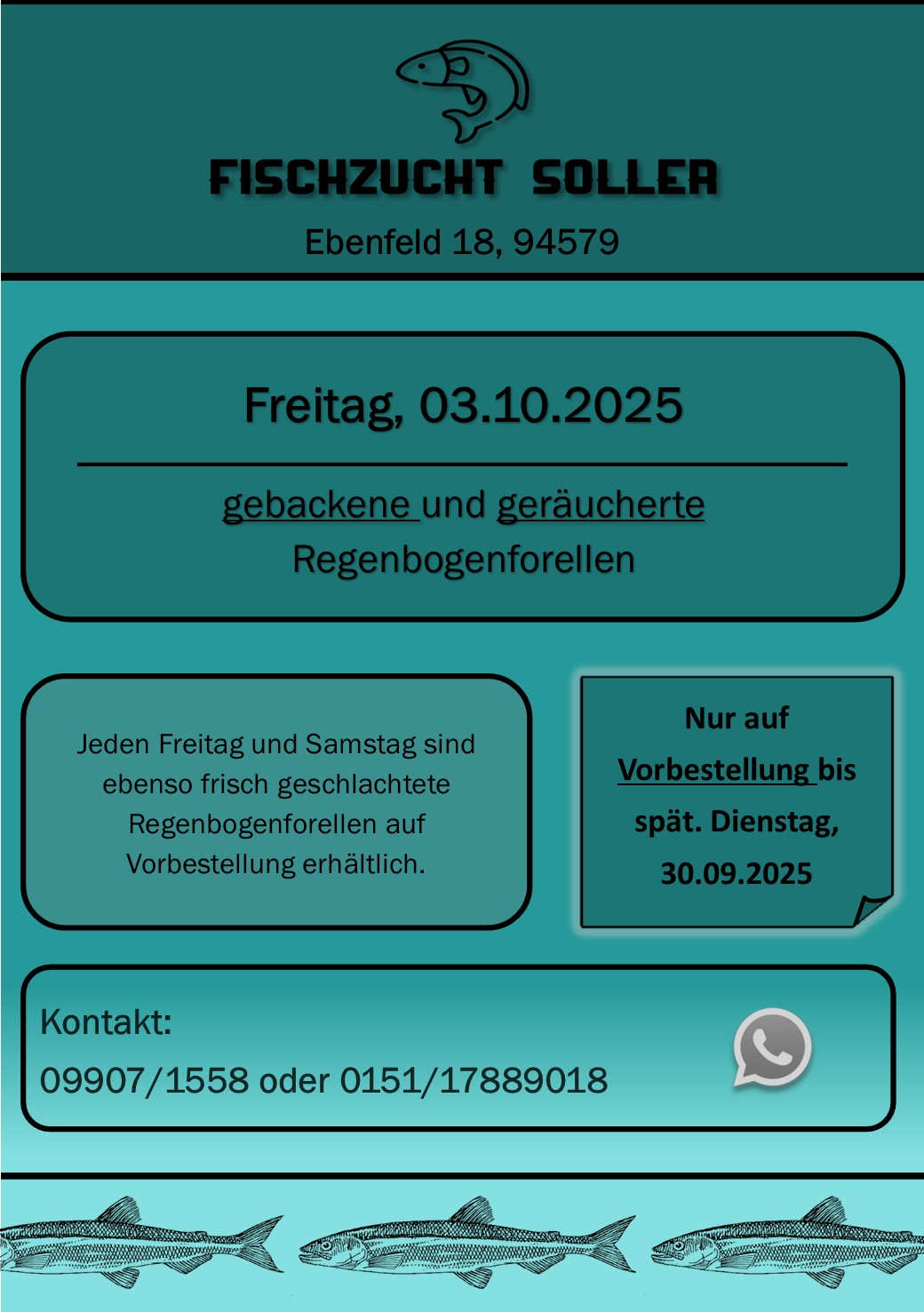 Am Samstag, den 06.09.2025 gibt es wieder geräucherte Regenbogenforellen auf Vorbestellung. Bitte meldet euch unter den angegebenen Telefonnummern zur Vorbestellung! Ebenso sind auch frische und filetierte Forellen auf Vorbestellung erhältlich.